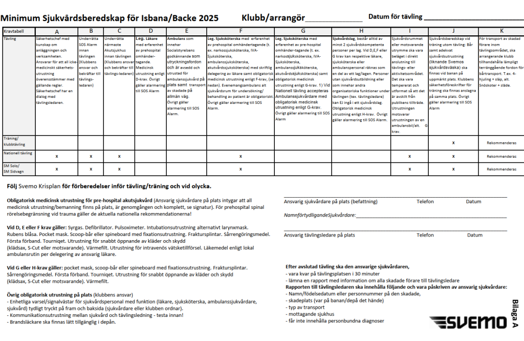 Rapporten till tävlingsledaren ska innehålla följande och vara påskriven av ansvarig sjukvårdare: