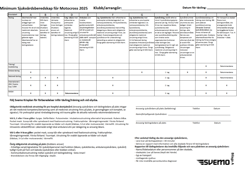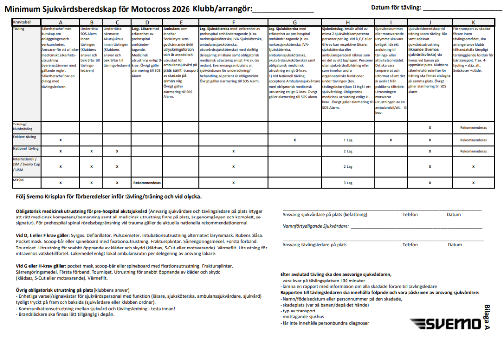 Följande gäller sjukvårdsberedskap vid enklare tävling, enligt bilaga A) SR Motocross