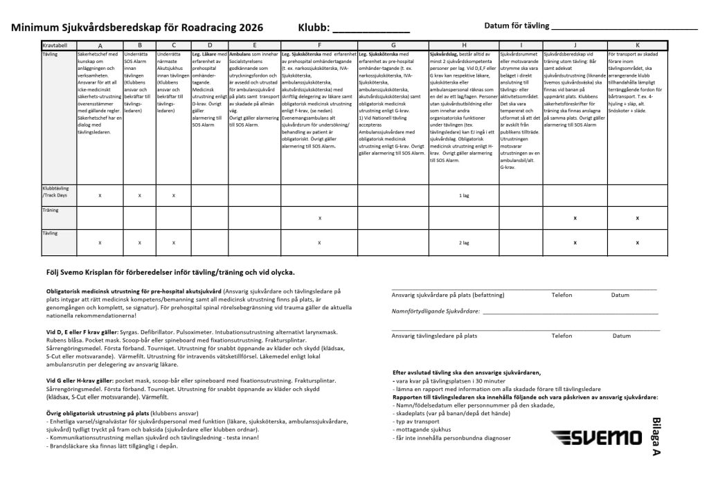 - Bemanningsplan för respektive Svemo-godkänd bana ska användas som en rekommendation. Licensierad Tävlingsledare/Träningsledare är ansvarig för att säkerheten bibehålls.