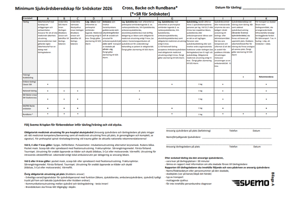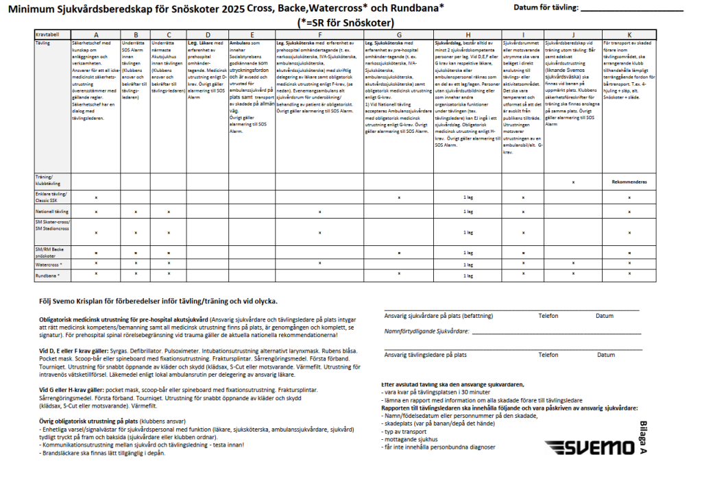 Svara för att erforderliga åtgärder vidtas för upprätthållande av ordning och säkerhet i samband med tävling i enlighet med SR Snöskoter. Bilaga A (sjukvårdsdokumentet)