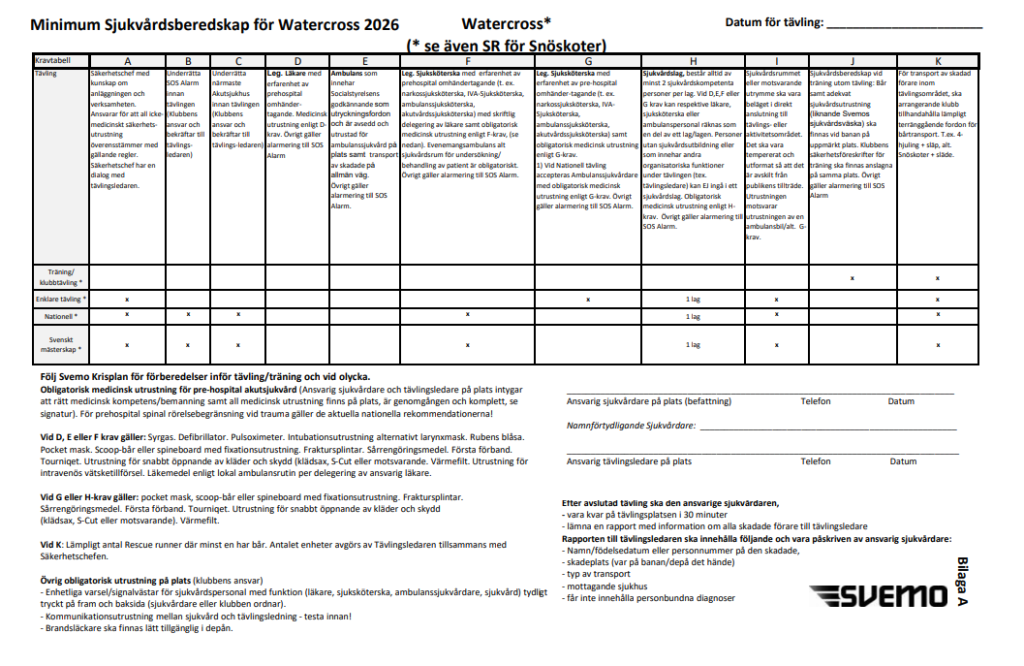 Deltagaren ska intyga att denne har läst Svemos nationella tävlingsreglemente och godkänner att följa dess regler och riktlinjer. Vidare intygar deltagaren att denne är fullt frisk utan diagnos, medicinering, rörelsehinder eller andra funktionsnedsättningar som kan påverka förmågan att träna och tävla inom Svemo Motorsporter.